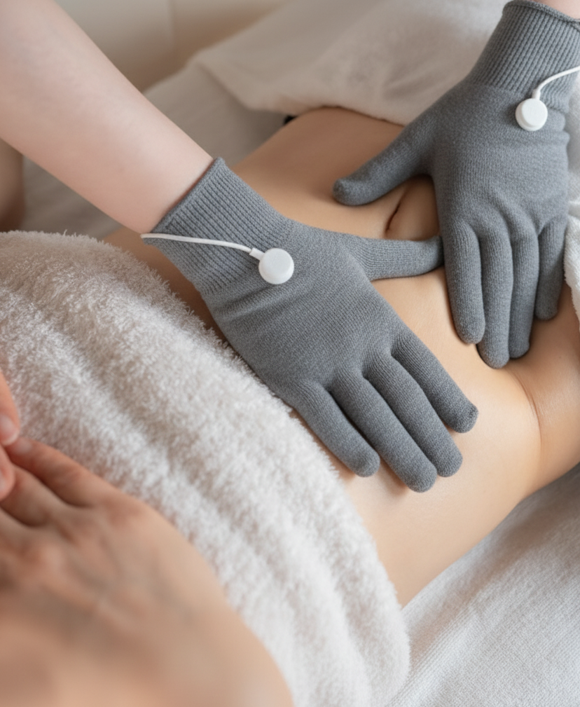 施術者の手に装着する「TMキューブグローブ」**を使用します。