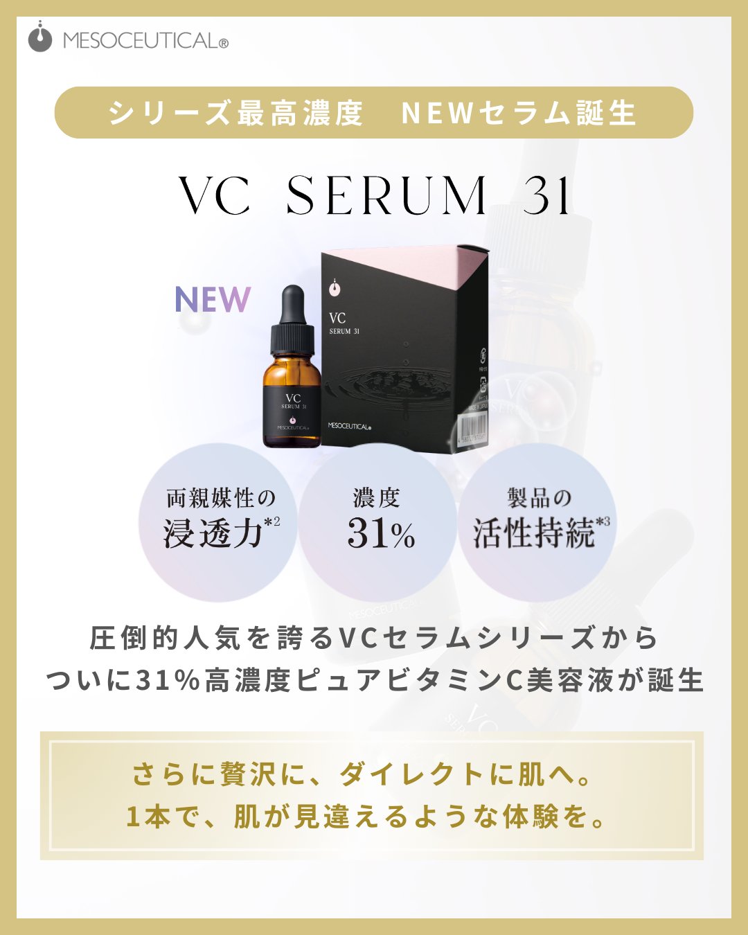 メソシューティカルの代名詞、高濃度ビタミンCセラムがさらなる進化を遂げました。 新作「VCセラム31」は、なんとピュアビタミンCを「31%」も配合!